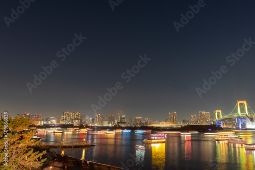 Obraz premium 東京お台場の夜景 レインボーブリッジと屋形船