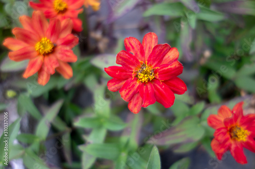Obraz premium 屋外に咲いた赤いジニアの花