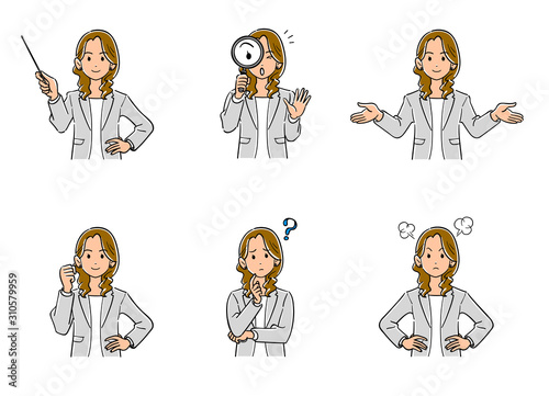© haru_natsu_kobo, Naklejka premium グレーのジャケットを羽織ったビジネスウーマンの上半身 6種類のポーズのセット