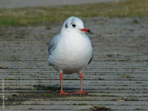 Obraz premium 河川敷の遊歩道上のユリカモメ