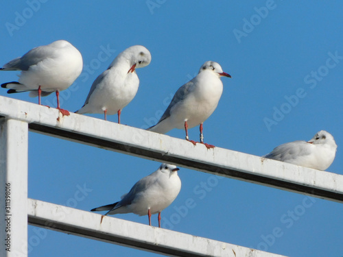 Obraz premium 水管橋に並んで留まるユリカモメ(足環あり)