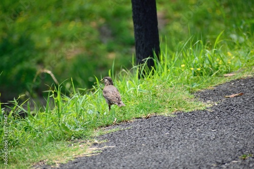 Obraz premium 草むらを歩くムクドリ