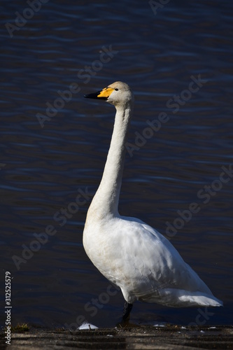 Fototapeta premium 黒いしるしは、彼か彼女の個性、世界のどこかで君に気づく。オオハクチョウ成鳥。黄色い嘴に黒い特徴的模様