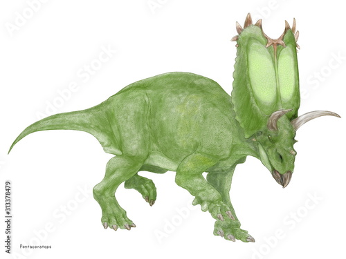 © Mineo, Obraz premium ペンタケラトプス 「五本の角のある顔」を意味する古代ギリシャ語で命名された角竜類。目の上の2本の角 鼻の上の短い角、そして2本の頬骨の突起がその由来である。最大で8メートル程度の角竜だがフリルは大きく重量感がある。白亜紀後期の北米大陸に生息した。同時期の恐竜トリケラトプスの生息域と重なっている。