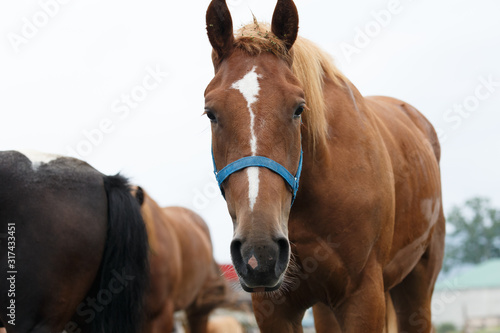 Fototapeta premium 日本の北海道東部・夏、牧場の馬