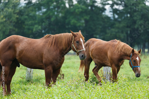 Fototapeta premium 日本の北海道東部・夏、牧場の馬