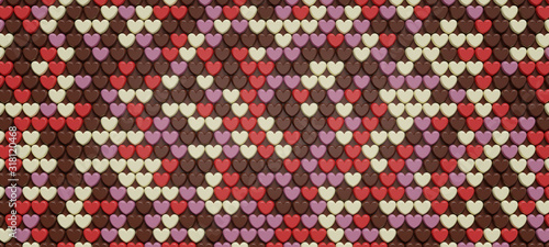 Fototapeta premium 小さなハートの形のチョコレートが規則的に並んだ背景画像。