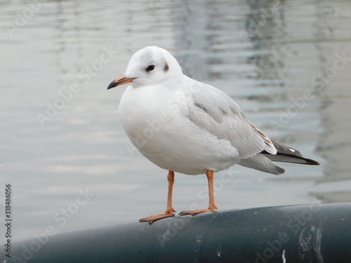 Fototapeta premium 川岸の柵に留まるユリカモメの若鳥