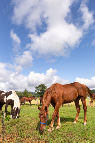 Fototapeta premium 日本の北海道東部・9月、放牧された馬