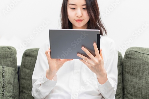 © garage38, Fototapeta premium リビングでタブレットを操作する女性