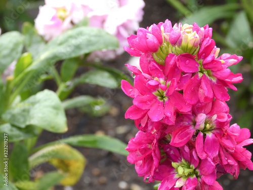 Fototapeta premium 雨の日に咲いた赤色のストックの花