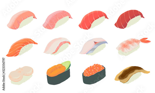 © eringo, Naklejka premium いろんなお寿司の素材イラスト 特上握り シームレス
