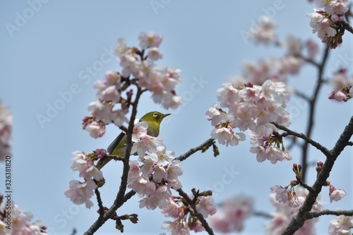 Obraz premium 満開の大寒桜と緑色の美しい小鳥(メジロ)018