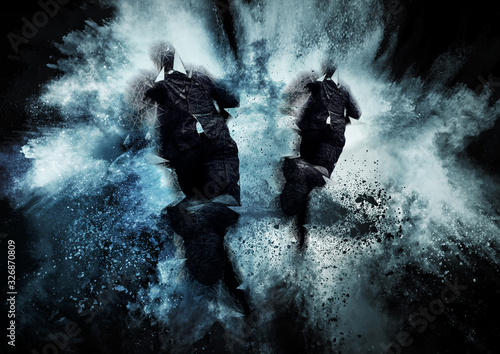 © k_yu, Obraz premium ビジネスの挑戦の概念で爆発に飛び込むビジネスマン