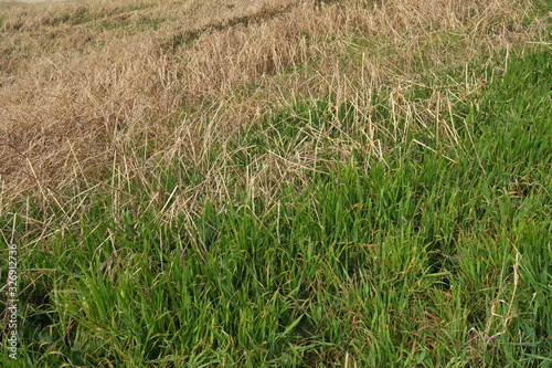 Obraz premium 枯れ草と若葉のある早春の土手風景