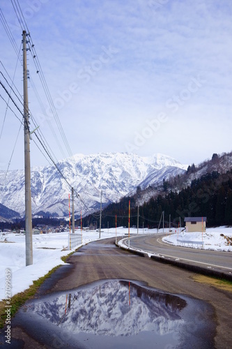Obraz premium 霊峰を映す歩道の水たまりでのリフレクション
