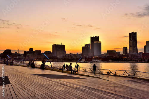 © masyok, Fototapeta premium 大桟橋から夕方のみなとみらいを眺める人々