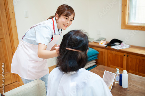 © Monet, Obraz premium メイクの手伝いをする女性ヘルパー