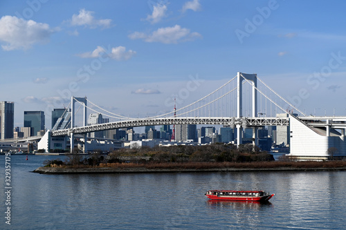 Fototapeta premium 2020年東京オリンピックの年の東京の風景 1月のお台場で停泊する屋形船と青空の風景