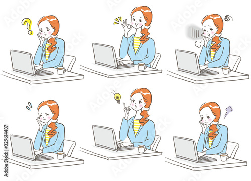 © とーふねこ, Fototapeta premium パソコン 女性表情セット 手描きイラスト