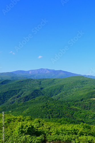 Obraz premium 初夏の寺沢高原より早池峰山を望む。遠野、岩手、日本。5月下旬。
