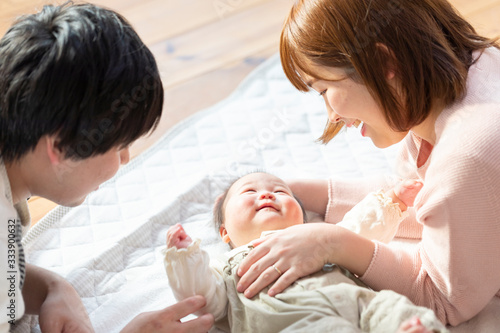 Fototapeta premium 赤ちゃんを中心に寝転ぶ幸せそうな父と母
