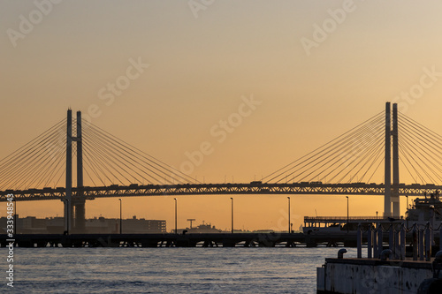 Fototapeta premium 朝日の中の横浜ベイブリッジ(撮影場所:臨港パーク)