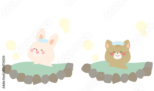 © いなみ, Obraz premium 温泉に入るうさぎとネコのイラスト セット