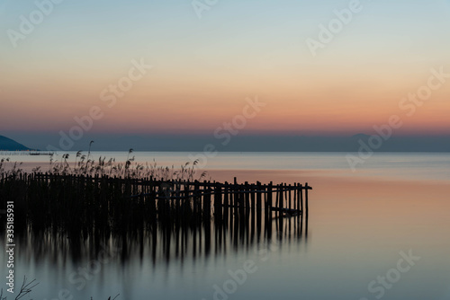 Obraz premium 夜明けのオレンジの空と琵琶湖