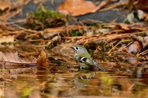 Obraz premium 水浴びを楽しむキクイタダキ