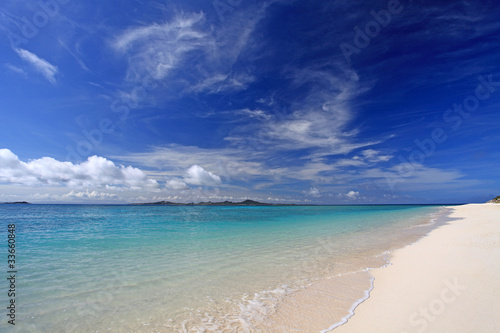 © sunabesyou, Fototapeta premium 美しいビーチに打ち寄せる波と青い空