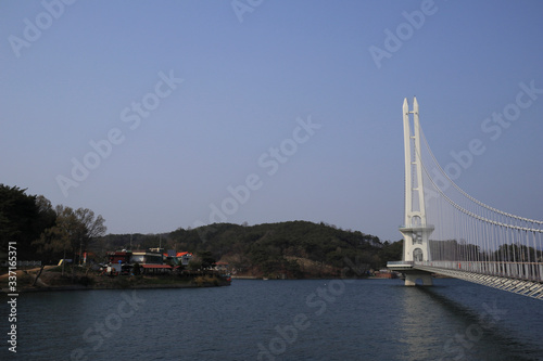Obraz premium 흰색 교량과 호수가 보이는 아름다운 풍경