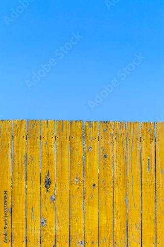 Fototapeta premium 青空と黄色の古びた板塀。背景用素材