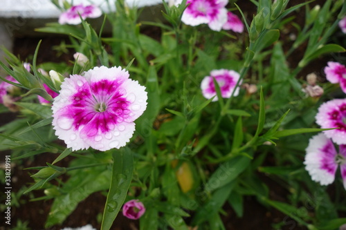 Fototapeta premium 雨に濡れた白と紫の撫子の花