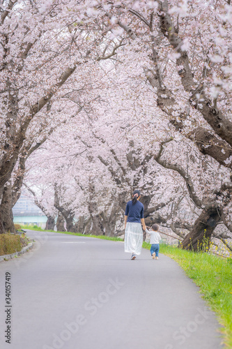 © Naoto TAKAHASHI, Fototapeta premium 桜並木を手をつないで散歩する親子