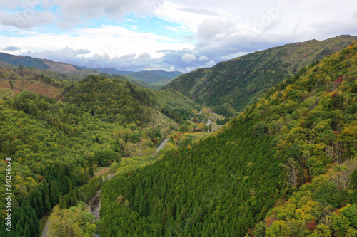 Fototapeta premium 高山 紅葉 ドローン空撮 せせらぎ街道