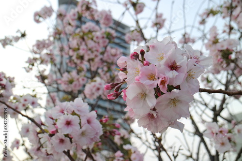 Obraz premium ビルと桜を見上げる