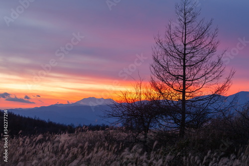 © photop5, Fototapeta premium 御嶽山と夕焼け空、長野県岡谷市高ボッチ高原にて