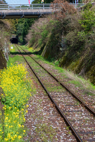 © doraneko777, Fototapeta premium 春の線路沿いに咲く菜の花【福岡県行橋市】
