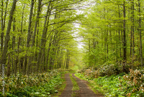 Obraz premium 新緑の青葉芽吹く北海道の林道