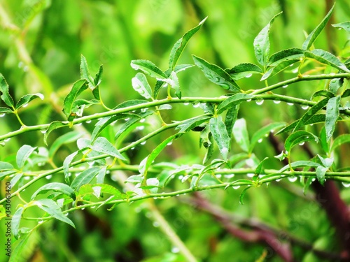 Obraz premium 日本の田舎の風景 8月 雨降り 葉にとまる水滴