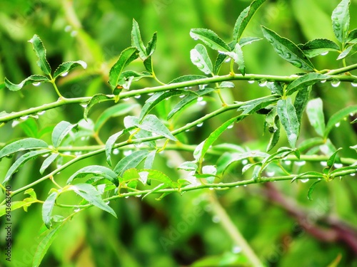 Fototapeta premium 日本の田舎の風景 8月 雨降り 葉にとまる水滴