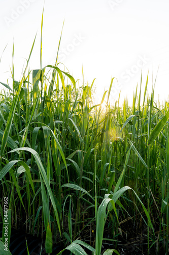 Obraz premium 朝日と朝露の逆光写真