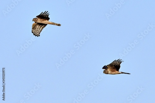 Obraz premium 青空バックに飛ぶ2羽のハイイロチュウヒ メス