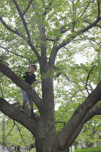 Fototapeta premium 木登りをする小学生(5年生)