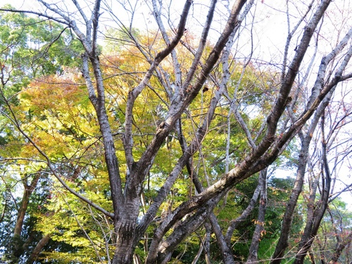 Fototapeta premium 日本の田舎の風景 11月 裸木と黄葉