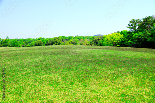 Obraz premium 芝生広場 芝生公園 新緑の芝生 新緑の芝生広場 初夏の芝生広場 芝生 広場 新緑 公園 森林公園 青空広場 青空公園 グリーンパーク