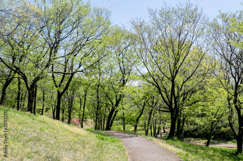 © oonoteruaki, Obraz premium 丘の上で見上げる大きな桜の新緑の葉が眩しい
