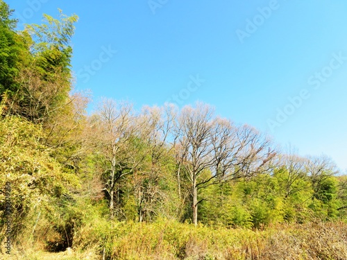 © 史恵 堤, Obraz premium 日本の田舎の風景 12月 山の木々と青空