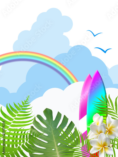 Obraz premium サーフィン ハワイ レジャー トロピカル 南国 サーファー モンステラ 夏